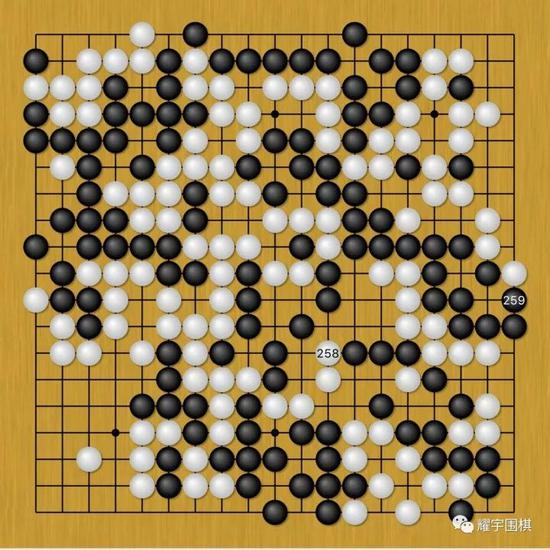 图13:最后时刻,双方在右边打一个无关胜负的劫,柯洁白258找劫才的时候,井山若跟着应劫而放弃右边劫争的话,黑棋盘面13目赢定了。但他真够玩命的,黑259居然消劫了!后来黑大空里再起波澜!险些就出大问题了!