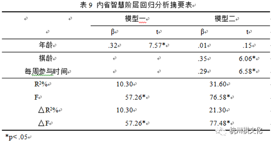 控制变项年龄进入模型一后,F值达到显著水平,t值亦达显著水平,解释变异量为10.3%,显示年龄对于内省智能之预测力具有显著贡献。预测变项棋龄与每周参与时间进入模型二后,解释变异量增为31.6%,F值达到显著水平,棋龄与每周参与时间之t值亦均达显著水平,且解释变异量之增加量达到21.3%,显见棋龄与每周参与时间对于内省智慧之预测力具有显著贡献。由以上分析结果可知,将年龄因子予以控制之后,棋龄与每周参与时间对于围棋参与者之内省智慧发展具有预测力,意即围棋参与者之棋龄越长,每周参与时间越多,内省智慧之发展则越高。阶层回归分析结果摘要如表9所示。