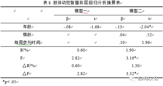 控制变项年龄进入模型一后,F值并未达到显著水平,解释变异量为趋近于0的0.6%。预测变项棋龄与每周参与时间进入模型二后,解释变异量略增为1.9%,虽然F值达到显著水平,但棋龄与每周参与时间之t值均未达显著水平,且解释变异量之增加量只有1.3%,仍然偏低,故不具有实质上的意义。由以上分析结果可知,棋龄与每周参与时间对于围棋参与者之肢体动觉智慧发展较无预测力。阶层回归分析结果摘要如表8所示。