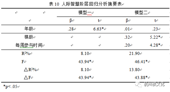 控制变项年龄进入模型一后,F值达到显著水平,t值亦达显著水平,解释变异量为8.1%,显示年龄对于人际智能之预测力具有显著贡献。预测变项棋龄与每周参与时间进入模型二后,解释变异量增为21.9%,F值达到显著水平,棋龄与每周参与时间之t值亦均达显著水平,且解释变异量之增加量达13.8%,显见棋龄与每周参与时间对于人际智慧之预测力具有显著贡献。由以上分析结果可知,将年龄因子予以控制之后,棋龄与每周参与时间对于围棋参与者之人际智慧发展具有预测力,意即围棋参与者之棋龄越长,每周参与时间越多,人际智慧之发展则越高。阶层回归分析结果摘要如表10所示。