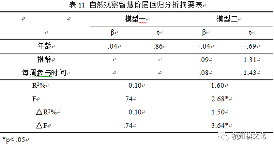 控制变项年龄进入模型一后,F值并未达到显著水平,解释变异量为趋近于0的0.1%。预测变项棋龄与每周参与时间进入模型二后,解释变异量略增为1.6%,虽然F值达到显著水平,但棋龄与每周参与时间之t值均未达显著水平,且解释变异量之增加量只有1.6%,仍然偏低,故不具有实质上的意义。由以上分析结果可知,棋龄与每周参与时间对于围棋参与者之肢体动觉智慧发展较无预测力。阶层回归分析结果摘要表如表11所示。