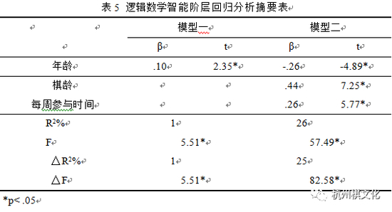(1) 本研究假设棋龄对于逻辑数学智能、空间智能、内省智慧与人际智慧具有显著预测力,