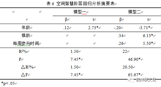 控制变项年龄进入模型一后,F值达到显著水平,解释变异量为偏低的1.5%。预测变项棋龄与每周参与时间进入模型二后,解释变异量增为22%,F值达到显著水平,棋龄与每周参与时间之t值亦均达显著水平,且解释变异量之增加量达到20.5%,显见棋龄与每周参与时间对于空间智慧之预测力具有显著之贡献。由以上分析结果可知,棋龄与每周参与时间对于围棋参与者之空间智慧发展具有预测力,意即围棋参与者棋龄越长,每周参与时间越多,空间智慧之发展则越高。阶层回归分析结果摘要如表6所示。