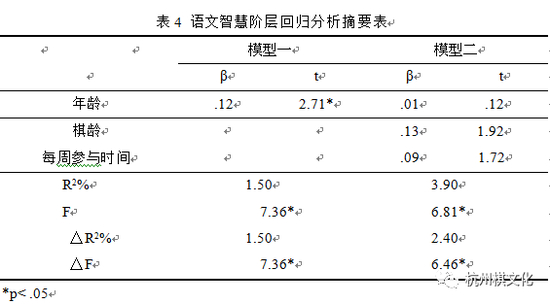 控制变项年龄进入模型一后,F值达到显著水平,解释变异量为偏低的1.5%。预测变项棋龄与每周参与时间进入模型二后,解释变异量略增为3.9%,虽然F值达到显著水平,但棋龄与每周参与时间之t值均未达显著水平,且解释变异量之增加量只有2.4%,并不具有实质上的意义。由以上分析结果可知,棋龄与每周参与时间对于围棋参与者之语文智慧发展较无预测力。阶层回归分析结果摘要如表4所示。