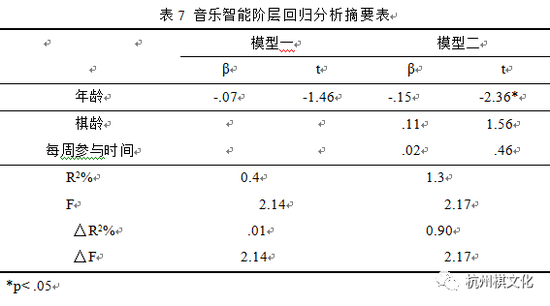 控制变项年龄进入模型一后,F值并未达到显著水平,解释变异量为趋近于0的0.4%。预测变项棋龄与每周参与时间进入模型二后,解释变异量略增为1.3%,然而F值并未达到显著水平,棋龄与每周参与时间之t值亦未达显著水平,且解释变异量之增加量只有0.9%,显见棋龄与每周参与时间对音乐智能发展之预测力无显著贡献。由以上分析结果可知,棋龄与每周参与时间对于围棋参与者之音乐智能发展较无预测力。阶层回归分析结果摘要如表7所示。