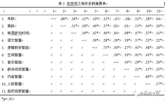 2。 将年龄变项控制后,每周参与时间对围棋参与者逻辑数学智能、空间智能、内省智慧与人际智慧具有显著之正向预测力。即围棋参与者每周参与时间越多,逻辑数学智能、空间智能、内省智慧与人际智慧之发展便越高。