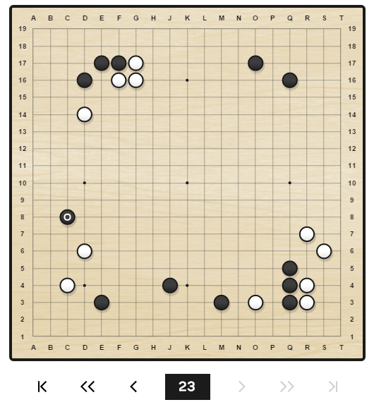 每一步点完都会自动跳转到下一个局面。我们留意到每一个局面下都有一个蓝色的虚线圈,应该是AlphaGo教学工具推荐的最佳选点。