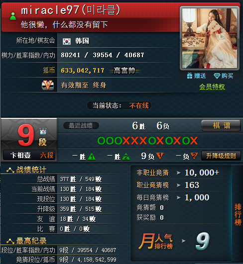 8强之中,miracle97(卞相壹六段)与恶霸一样延续好运气,递补入局,成为TWT线下决赛阶段唯一的韩国选手。