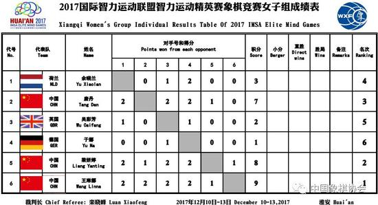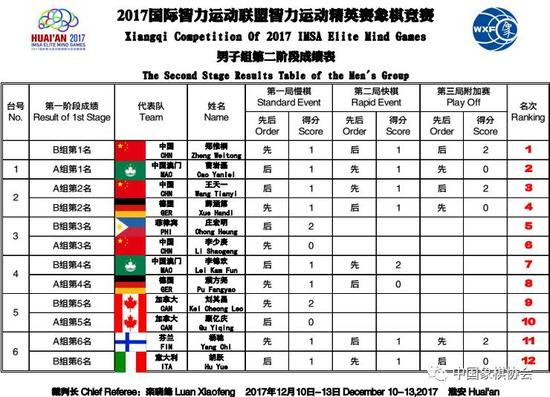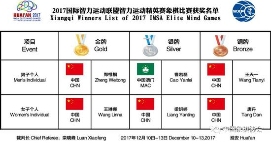 北京时间12月13日,2017国际智力运动联盟智力运动精英赛象棋比赛在江苏省淮安市战罢。最终一场男子冠亚军争夺焦点大战、巅峰火拼,中国队“蜀山少侠”郑惟桐慢棋先手和、快棋后手和,附加赛(超快棋),郑惟桐执后手斗入双车马残局,反迫对方中国澳门队曹岩磊超时告负,郑惟桐超快棋惊险获胜夺冠,这是他的年度首座个人比赛金杯,之前曾在象甲、团体赛、世锦赛获得三项团体金牌,曹岩磊遗憾失利,拿到亚军。中国队王天一、德国队薛涵第获得季军、殿军。女子组中国队“大姐大”王琳娜以五战4胜1平积9分成功实现蝉联,中国队梁妍婷、唐丹分获亚季军。