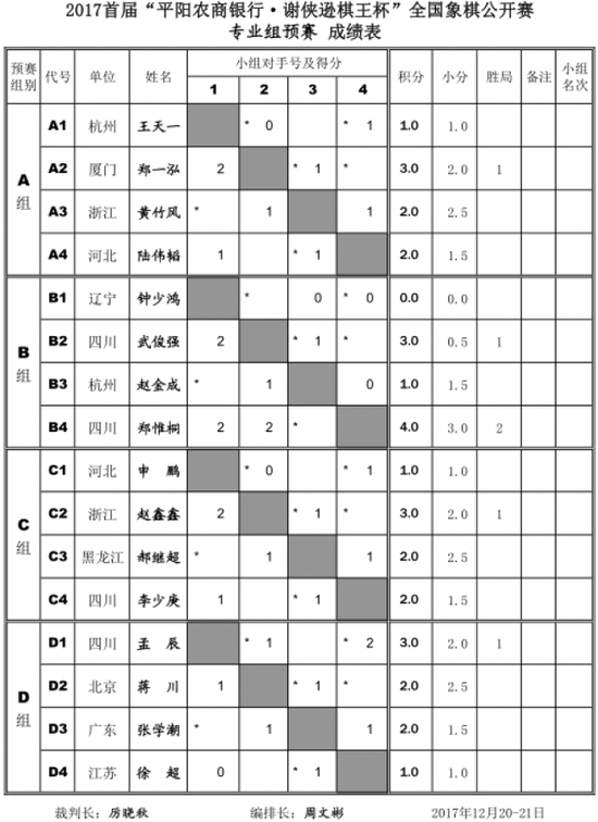 是此专业组首日两轮下来,A组郑一泓1胜1平3分,黄竹风、陆伟韬2连和2分,王天一1和1负1分;B组郑惟桐两连胜4分,武俊强1胜1和3分,赵金成1和1负1分,钟少鸿两连败0分;C组赵鑫鑫1胜1和3分,李少庚、郝继超两和2分,申鹏1和1负1分;D组孟辰1胜1平3分,蒋川、张学潮两和2分,徐超1和1负1分。
