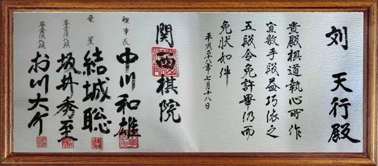 2016年,刘天行同学以本组全胜夺冠战绩获得关西棋院业余五段证书,关西三大棋士的签名够珍贵,够神气吧?