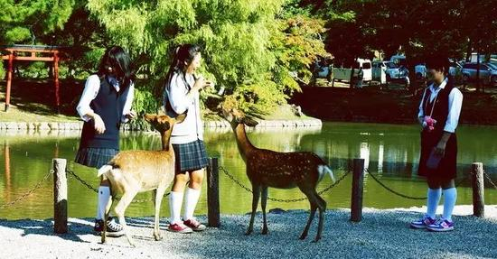 关于随处可见的奈良鹿的传说:公元710年在创建奈良的春日神社时,从鹿岛请来的神仙骑鹿而来,人们因此认为鹿是神的使者,若有谁敢捕鹿杀鹿,或是伤鹿,都会受到严厉处罚,甚至可获死罪。可想而知奈良的鹿在人们心目中是何等神圣和尊贵。