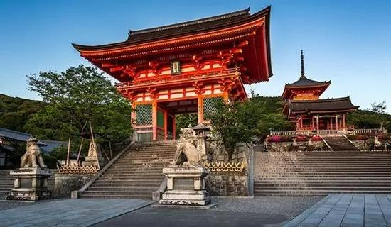 京都清水寺,位于京都东部音羽山的山腰,始建于778年,是京都最古老的寺院,1994年被列入世界文化遗产名录。本堂前悬空的清水舞台是日本国宝级文物,四周绿树环抱,春季时樱花烂漫,是京都的赏樱名所之一,秋季时红枫飒爽,又是赏枫胜地。