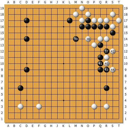实战图4:之后37、39基本都是秒下,当时感觉很必然,黑41粘很想立下去分断反击,考虑一下之后还是冷静了。