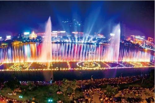 柳江喷泉,总长度315米,宽40米,主喷最大喷高100米,是目前世界上江面最大的升降浮式喷泉。