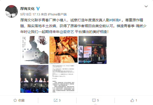 5月18日,厚海文化在微博中发文表示:厚海文化联手青春厂牌小糖人,诚意打造年度漫改真人剧#棋魂# 。尊重原作精髓,踏实落地本土改编,获得了原著作者堀田由美空前认可。棋逢青春季·魂燃少年时让我们一起期待来年@爱奇艺 平台播出的美好相逢!