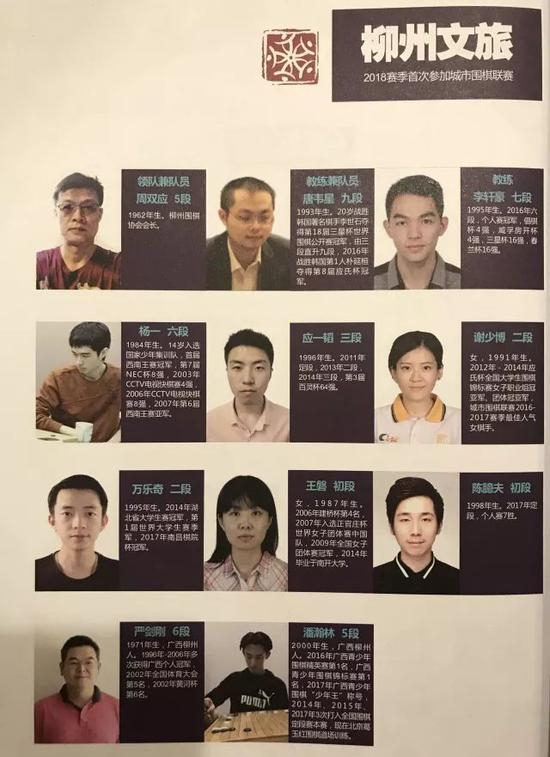 柳州文旅俱乐部作为城围联中的新面孔,综合实力强劲,赛队诚邀广西围棋协会副主席周双应作为领队,唐韦星九段作为教练兼队员,李轩豪七段作为教练,率领杨一六段,陈镱夫初段、万乐奇二段、谢少博二段、王磐初段、应一韬二段、潘翰林5段、严剑刚6段等队员参与比赛。