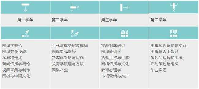 四年的教学过程中,学生将在以上合作单位成建制的进行在岗实践,例如在围棋培训学校担任实习教师;在我集团赞助的围棋比赛中担任实习裁判、会务;在腾讯、东方网体育频道担任实习编辑、记者;在棋牌公益行中担任活动策划、市场推广。这些实践活动将让学生在毕业前就培养卓越的实战能力,顺利高起点就业。