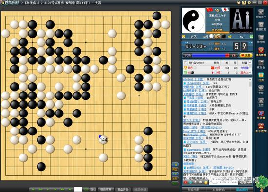 为了活棋,AQ的大龙不得不一头冲进上方如黑洞般深邃的黑阵中,蜿蜒曲折的求生路上不知损掉多少利益,但此时显然已经顾不上那么多。黑棋一边攻击一边在四周大肆劫掠,白棋终于看到做活曙光时,被分断的另一半大龙——中腹八个白子早已在不知不觉中被黑棋鲸吞。再次付出左上角被撞伤的代价后,AQ倔强的为大龙摆出两眼,然后投子认负。