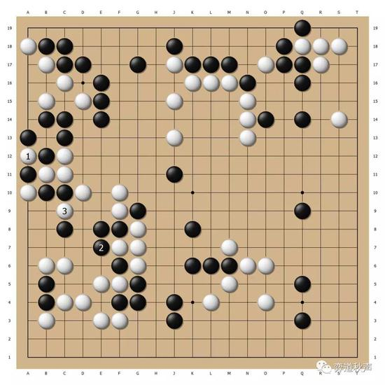 图三:坂田黑1提劫时,加藤的白2是大错觉。黑3吃三子,棋局逆转。