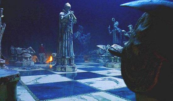巨型棋子棋盘,暗蓝幽森的背景,附上隐约低沉的音乐,这盘棋不再是轻松愉快的对弈,而是被魔法操纵的机关——唯有胜利,才能继续前进。失败者的下场将如被吃的棋子一样,要么粉身碎骨,要么鼓起勇气,调用所有子力,拼杀出希望。哈利一行人站在棋盘上,思索着如何通过这一关卡。