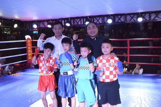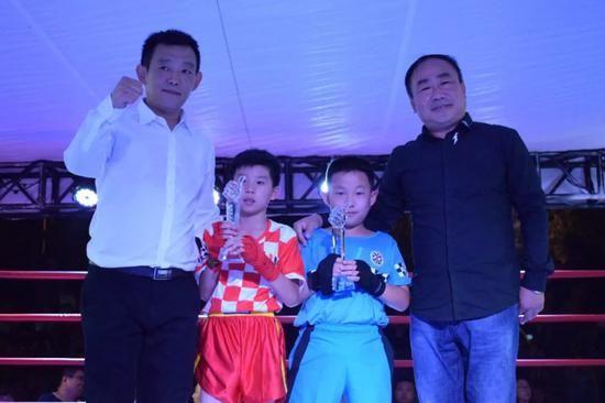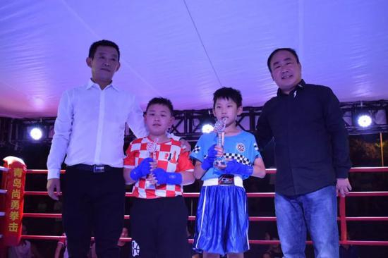 青伟少年,加油!(图为拳击裁判长刘林先生与国际象棋裁判长王青伟先生为参赛棋手颁发纪念奖杯)