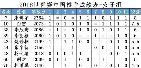 15岁的白雪凭借最后阶段精彩的四连胜,冲入了前十名。李欣玙和李芸杉同积6分。楚若桐、宋宇新和杨弋靖同为5.5分。胡聿和杜雨馨分别为5分和4.5分。