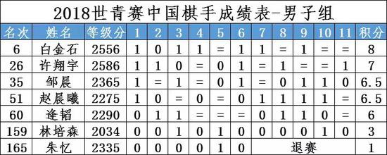 许翔宇以7分排名第26,邹晨和赵晨曦同积6.5分。逄韬积6分。林培森和朱忆分别为3分和1分。
