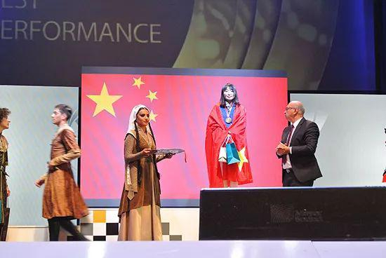 居文君还斩获了本届奥赛最佳女棋手奖,她身披五星红旗上台,背后也是一面五星红旗,这位姑娘的年轻脸庞被衬红了。