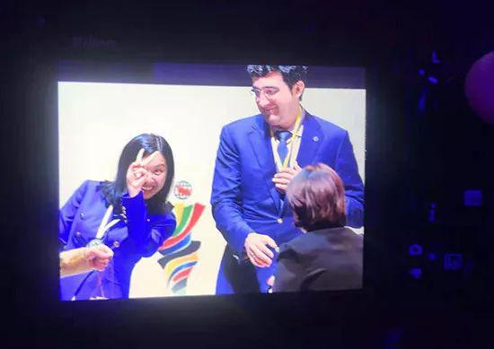 进入音乐厅,队伍的位置区贴有英文WINNER(获胜者)字样,担任颁奖嘉宾的格鲁吉亚著名世界棋后齐布尔达尼泽专门来到中国队前向队伍送上祝贺。已经身为国际棋联司库的中国世界棋后诸宸也来祝贺中国队双双夺冠。