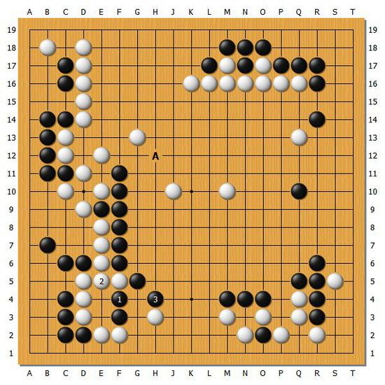 [图12]此时黑1挤或者在A位并的话,黑棋胜势的局面应该不可动摇。