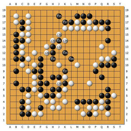 [图9]但是白棋在中央的处理有些保守,黑137的时候此时可以说是黑棋明显优势的局面。