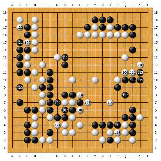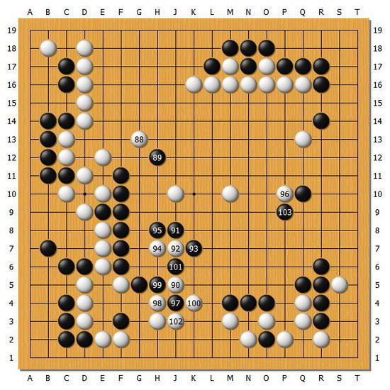 [图6]黑棋吃掉中央的两颗白棋,然后黑103回到了右边的扳,到这里觉得是黑棋可战的局面,但是形势是白棋稍好的局面。