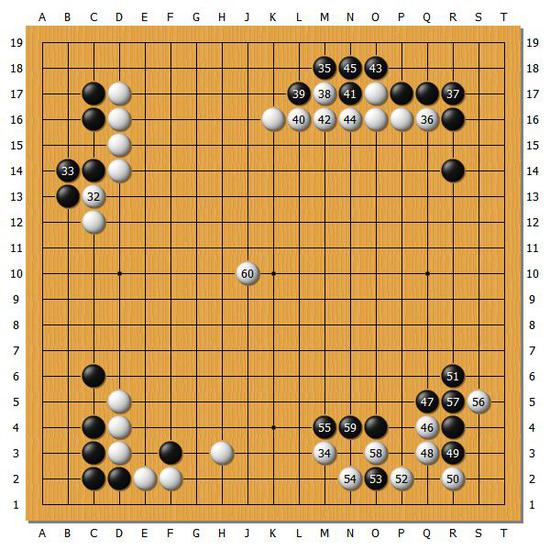 [图1]这盘棋一开始,下成了井山裕太占据实地,而张栩选择占据外势的局面。