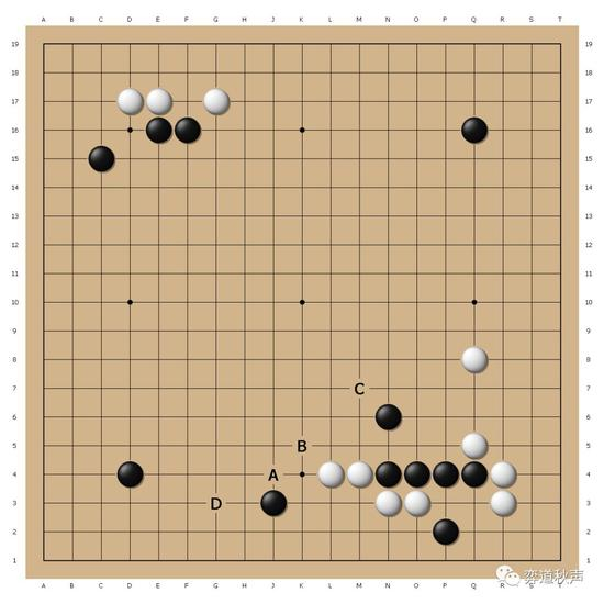 右下角是黑棋从上边碰白棋大飞守角一子形成的棋形,双方进入未知领域。现在轮到白棋走,如何掌握攻防节奏为好呢?A、B、C、D四个点您会选择哪一个?