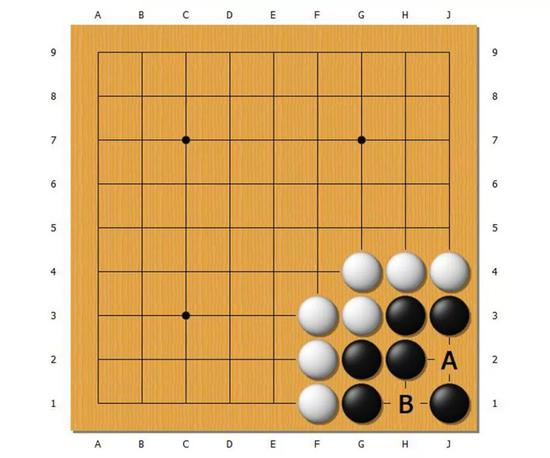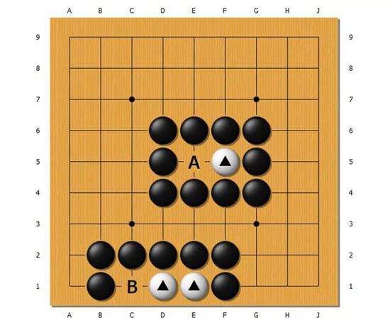 这两个图的黑棋,周围都被白棋包围无法逃脱,但是实际上,这些黑棋其实都是绝对都吃不了的棋。仔细看就知道,这些图的A和B都是禁入点。比如说——