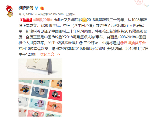 新浪棋牌2019你我相约 转发抽奖赢取限定台历