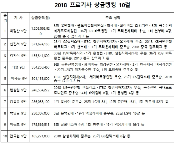 近日韩国棋院公布了2018棋手奖金榜,朴廷桓获12亿850万韩元奖金,超过2017年两倍收入,在韩国棋院高居榜首。申真谞等16人获1亿以上奖金。