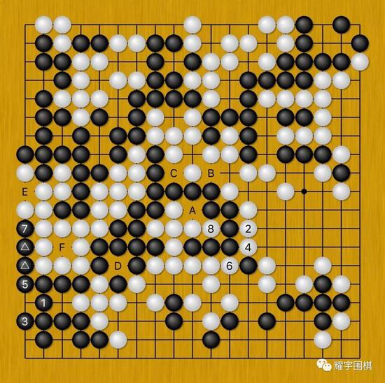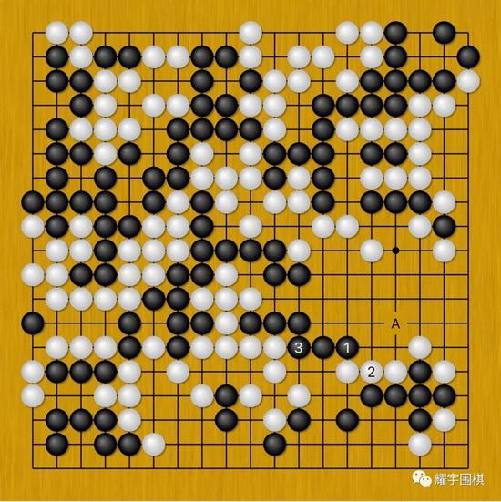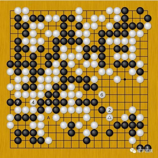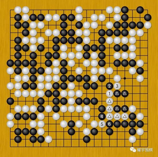 这是廖行文漏算的一步好手,此手一出,黑中央三角大块已然无法回家了: