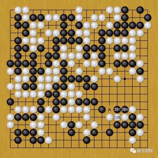 图8:白240冲的时候,小廖就直接在244位挡住也没问题(因为白三角四子下一手必须在A位连络)。