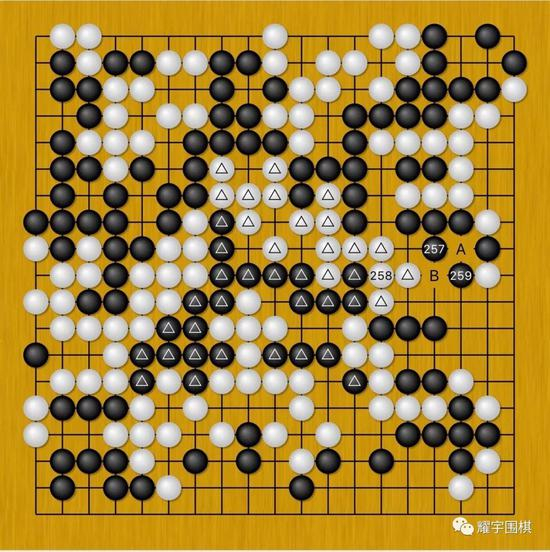 对此白258不能在黑259位粘上,不然黑B位一冲,白三角大块要出问题了。