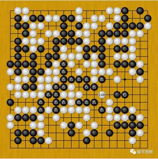 黑241先手打一下后,黑243、245跳了一并,企图通过吃掉白圆圈两子来与黑右下角连络。