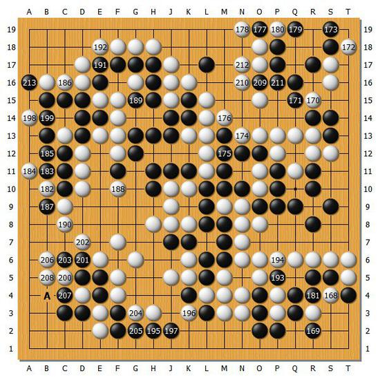 【图11】之后白棋开始猛追,局面也变得细微起来。黑213实战扳角,但是此时在A位挡住会更大一些。