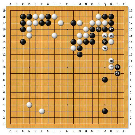 【图5】白棋行至白54,白棋在右边活得非常顺畅。黑棋也确实很难在右边找到合适的手段。