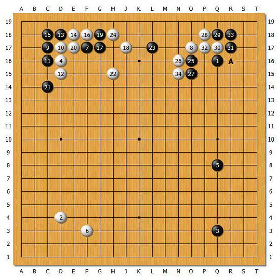【图1】本局伊始,双方在右上角展开了肉搏战。白28的倒虎是好手,黑棋之后下得也很紧,但是黑棋有A位断的余味,右上角整体还是比较薄。