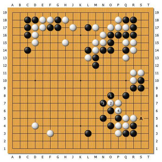 【图8】实战黑71选择在A位扳了一手,但是黑棋直接动手的话其实非常无理。黑棋在这里的判断还是相当出色的。
