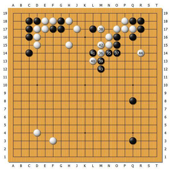 【图3】白38长出的话,其实对黑棋来说也相当难受。但是崔精九段考虑到上方的黑棋有可能会有妙手的出现,实战白棋选择了冷静补棋。
