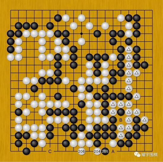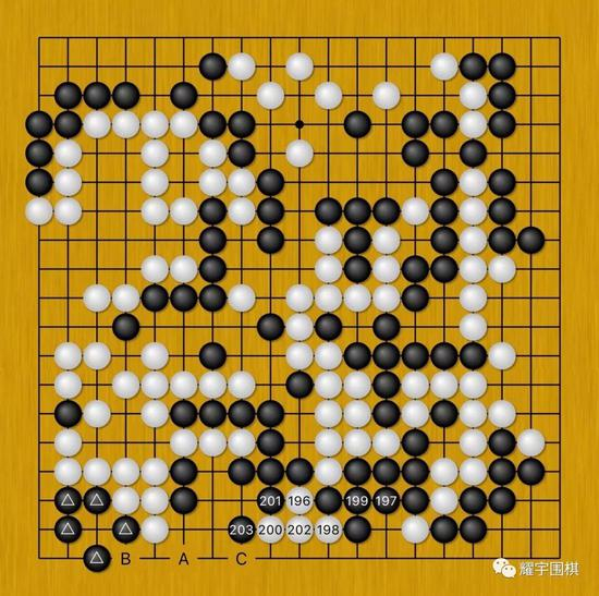 图9:朴廷桓白196至202,局部是送死,但因为白左下有A位小尖的手段(白A位小尖后,生出B位打劫杀黑左下角和C位一路渡过的手段),白棋局部可顽抗。