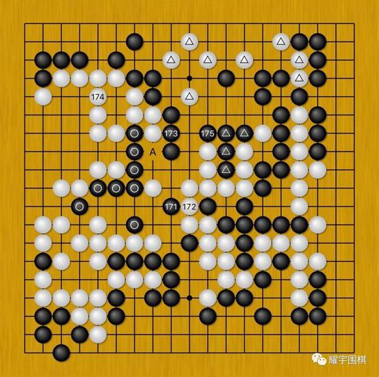 图2:面对黑171(黑三角一子)点的时候,实战朴廷桓白172应在A位接,正中党毅飞下怀。