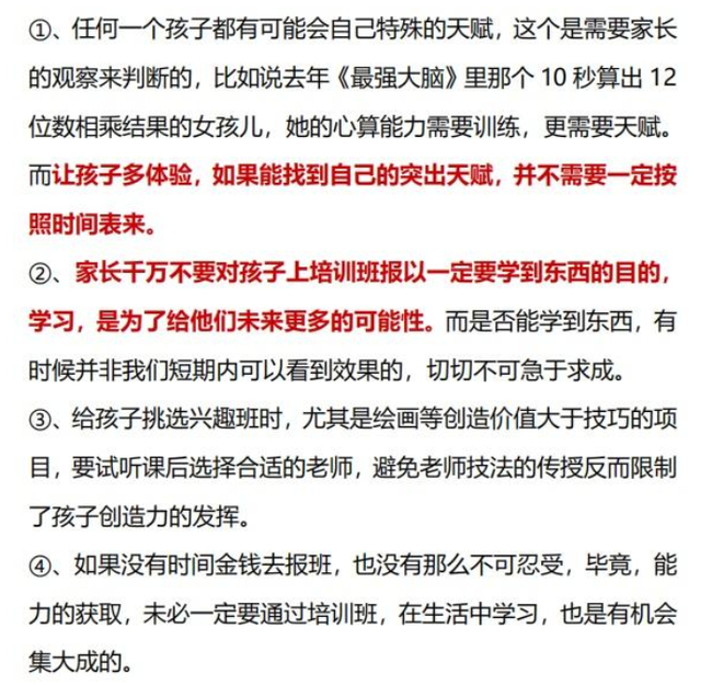 关于特长的培养和特长班的选择,北大教授还强调了很重要的几点,希望大家重视起来: